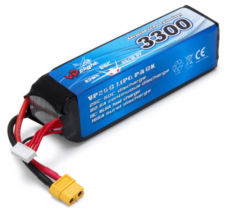 Li-Po, 18.5V 3300mAh, 25C, Dimension: 35mm*38mm*135mm, Weight approx. 420g. With YELLOW XT60 Female connector (Gold-Plated Plugs), and 120mm 13# Silicone Wires & 2.0mm JST-XH (6P) Balance Connector